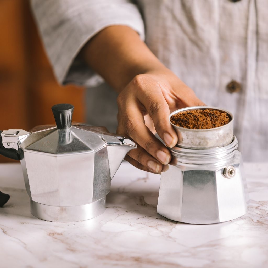 Now fill the Moka Pot's filter basket with ground coffee powder and give a gentle shake to settle the powder evenly.